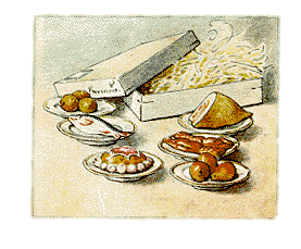 桌子上放着一顿多么丰盛的晚餐啊!这里有锡制的汤勺,还有铅制的叉子和小刀,还有两只小小的玩具椅子——一切都是那么令人满意!