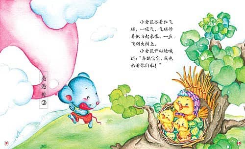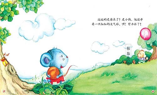 小老鼠抓着红气球,一吸气,气球带着他飞起来啦,一直飞到大树上。