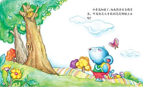 小老鼠知道了,他也想去看喜鹊宝宝,可是他怎么才能到高高的树上去呢?