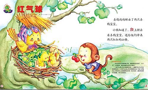小猴知道了,爬上树去看喜鹊宝宝,还给他们带来两只红红的山楂。