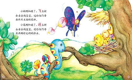 小蝴蝶知道了,飞上树去看喜鹊宝宝,还给他们带来两片美丽的花瓣。