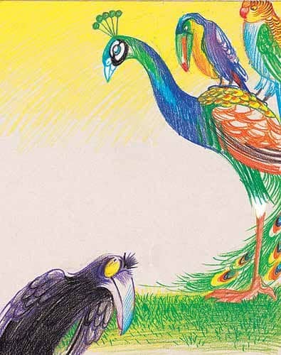 孔雀想来想去,总算想起来一种独一无二的颜色。想好了,立即动手,开始给乌鸦染羽毛。
