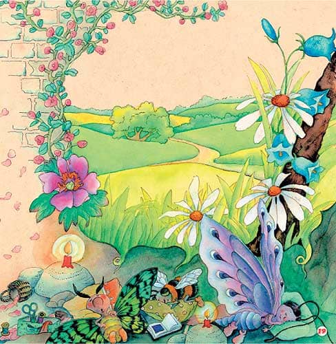 春天来了,蔷薇花开了,蝴蝶真高兴,她把橡子壳当做水杯,收集蔷薇花瓣上的露珠──这是多么甜蜜的饮料啊!