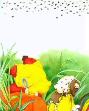 红袋鼠没有惊慌,迅速地脱下外衣包住头,蹲在草丛里。同时向小公鸡叫道:“快把书包腾出来,包住你的鸡脑袋!”
