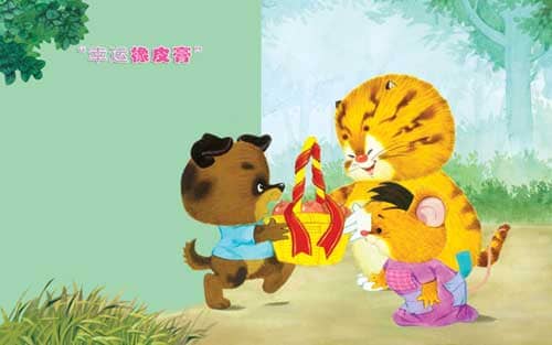 小狗也跑来了,拿着一篮子水果,告诉毛毛球:“有人给你送礼物来了。”