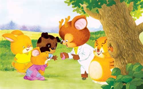 小老鼠东东把手划破了,嘟嘟老师叫他到医务室涂点儿药水。