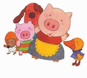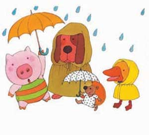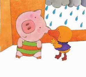 2、嘎嘎嘎,小鸭来了。她咬着小猪的耳朵说:“小猪,你知道吗,淋了雨我们就会长大的。”