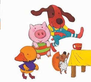 5、小猪找来了伙伴们,“你们想快快长大吗?”小猪问。小刺猬、小花狗、小鸭大声回答:“想呀想呀,想极了!”(小宝宝,比一比,4个小动物谁最高,谁最矮?)