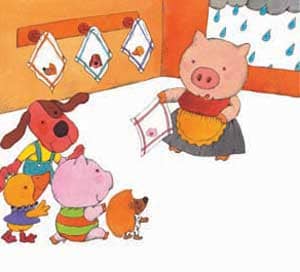 7、猪妈妈看见了,赶紧把孩子们都叫回家:“哎呀,你们一个个都被雨淋湿了,快进屋来擦擦干。”(小宝宝,你能帮小动物们找到他们各自的毛巾吗?)