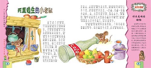 夏天的一个傍晚,小老鼠聪聪走出洞来散步。可能是晚餐桌上的肉馅饼做得太咸了,聪聪走了不多远便觉得渴得嗓子直冒烟,可它找来找去,哪儿也找不到一点儿水喝,便顺着桌腿儿爬上了桌子。嘿,好走运,桌上有只汽水瓶子躺在那里,里面还剩了些汽水。聪聪高兴得忘记了一切,拼命地钻了进去,“咕嘟、咕嘟”地喝了起来。啊,汽水又甜又凉,舒服极了。转眼间,剩下的那点儿汽水被它喝了个精光,聪聪伸伸脖子打了个嗝儿,快乐地笑了。