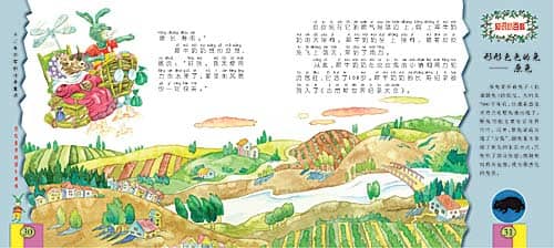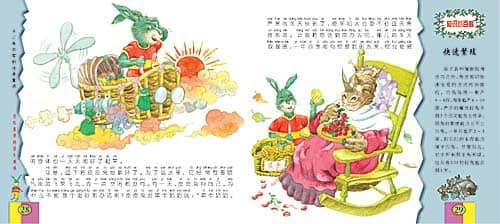 皮皮兔在它的喷气摇篮边上,绑上犀牛奶奶的大摇椅。犀牛奶奶坐上摇椅,随着皮皮兔飞上蓝天,来到了南方。