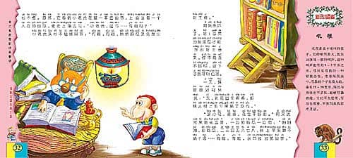阿呆想:“不行!我得想法儿变得聪明一些。”它来到图书馆翻书,可它不认得字,一点也不懂。忽然,它看到小老虎在翻一本图画书,上面画着一个人在拍脑瓜,便走上前去问:“小老虎,这书……有趣吗?”