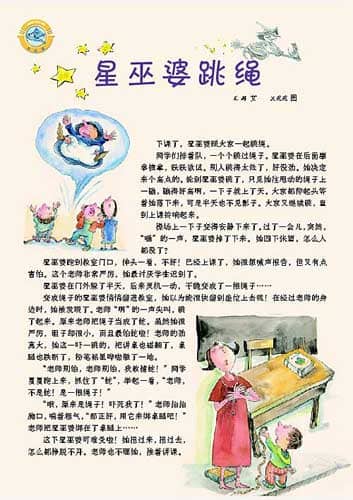 同学们排着队,一个个跳过绳子。星巫婆在后面摩拳擦掌,跃跃欲试。别人跳得太低了,好没劲。她决定来个高点的。轮到星巫婆跳了,只见她往甩动的绳子上一蹦,蹦得好高啊,一下子就上了天。大家都仰起头等着她落下来,可是半天也不见影子。大家又继续跳,直到上课铃响起来。