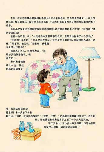 当米小虎背着书包回到家看到爸爸的时候,这才突然想起来。“哎呀!”他叫道,“还缺个笑脸呢!”
