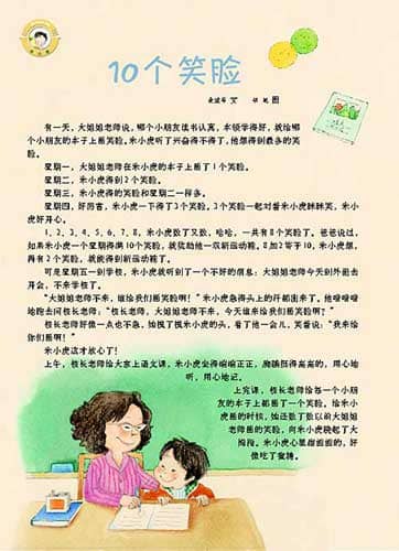 有一天,大姐姐老师说,哪个小朋友读书认真,本领学得好,就给哪个小朋友的本子上画笑脸。米小虎听了兴奋得不得了,他想得到最多的笑脸。