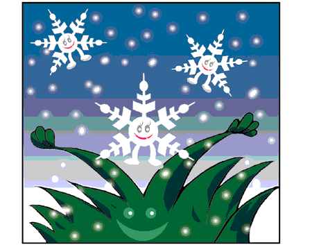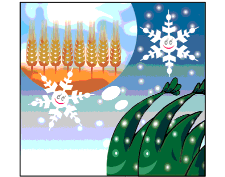 8.雪娃娃落在了小麦苗的身上,小麦苗张开双臂欢迎雪娃娃。