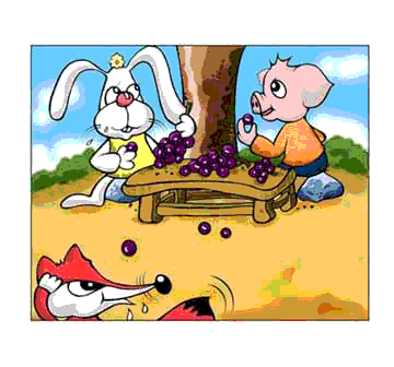 红狐狸路过,看见了桌上的葡萄,馋得直滴口水。他走上前说:“喂,你们知道吗,今天是个特殊的日子——不管谁有好东西吃,都得分给别人吃,要不吃了就会肚子痛!”