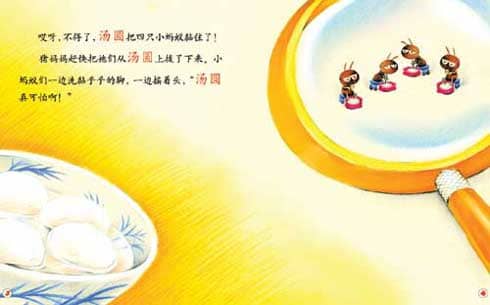 猪妈妈赶快把她们从汤圆上拔了下来。小蚂蚁们一边洗粘乎乎的脚,一边摇着头,“汤圆真可怕啊!”