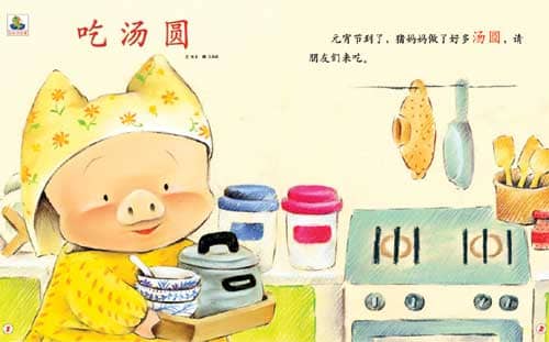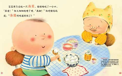 宝宝用勺舀起一只汤圆,轻轻地咬了一小口,“真香!”他又细细地嚼了嚼,“真甜!”他对猪妈妈说:“汤圆的味道好极了!”
