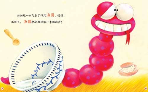 扭扭蛇一口气吞了四只汤圆。哎呀,不得了,汤圆把它撑得像一串糖葫芦!