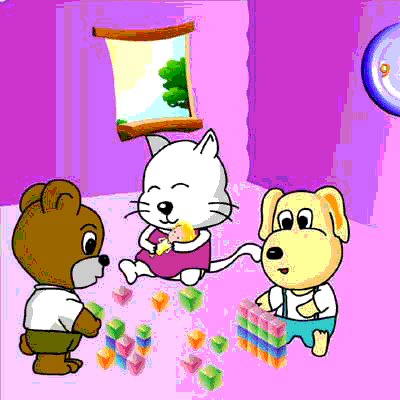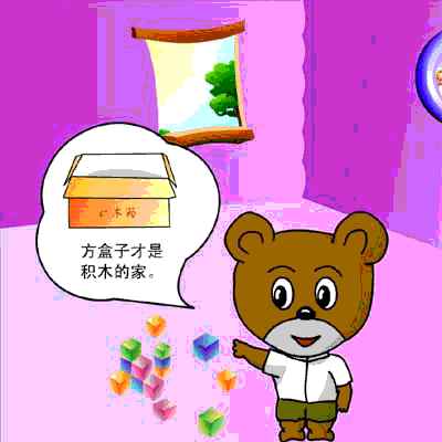 6、小熊连忙走过来告诉小狗小猫:方盒子才是积木的家,