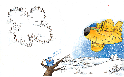 就在那片空地围好以后的一个星期,高又高真的又飞来了,小又小看见了高又高,她想飞起来去迎接他,可她的翅膀什么时候被冻住了,“叽喳叽喳……”小蓝鸟只能大声唱歌,她的歌声在白茫茫的停机场的上空飞来飞去,让高又高一下子就听见了,他便寻着声音飞过去,很快就看到了小蓝鸟,还看到了她身后用树枝插成的一架很大很大的飞机的形状,高又高激动得要命,他在空中绕着圈子仔细看,然后才稳稳地落下来,哈!正好嵌在树枝插成的大飞机的形状里面。
