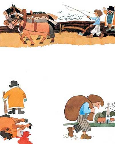 小克劳斯整天替大克劳斯干活,这天,他赶着五匹马儿犁地,把鞭子抽得呱嗒呱嗒响,喊道:“我的五匹马儿,使劲哟!”