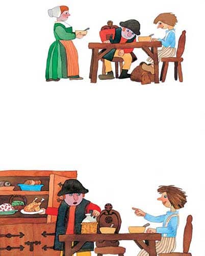 “好极了!”农夫马上把碗橱打开,看到了他妻子藏在里头的酒菜。