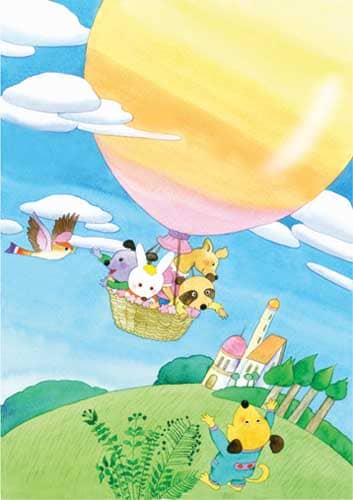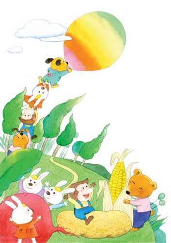 小动物们坐在筐里快乐地唱歌:“真好玩儿,真好玩儿,小狗俏俏会种田,种出一个大泡泡,带着我们天上转。”