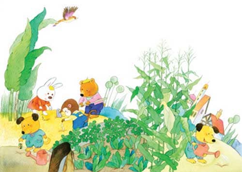 小兔的萝卜长出了叶子,小猴的花生苗蹿得很高,小熊的玉米结出了又长又大的果实。