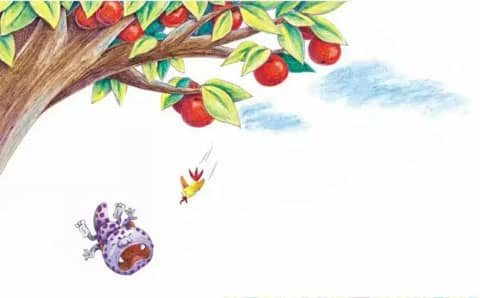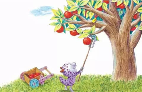 以前去树上摘苹果,因为他太重了,常常摔下来!现在,他忽然想到了一个办法。只要用一根竹竿儿,把苹果钩下来,不就可以了吗?