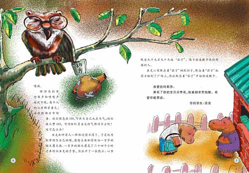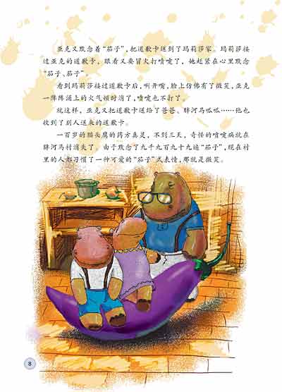一百岁的猫头鹰的药方真灵,不到三天,奇怪的喷嚏病就在胖河马村消失了。由于默念了九千九百九十九遍“茄子”,现在村里的人都习惯了一种可爱的“茄子”式表情,那就是微笑。