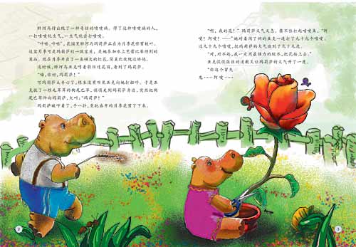 “咔嚓、咔嚓”, 花园里胖河马玛莉萨正在为月季花修剪枝叶。这盆月季可是玛莉萨的一级宝贝,是她参加水上芭蕾比赛得到的奖品。现在月季开出了一朵硕大的红花,简直比玫瑰还娇艳。
