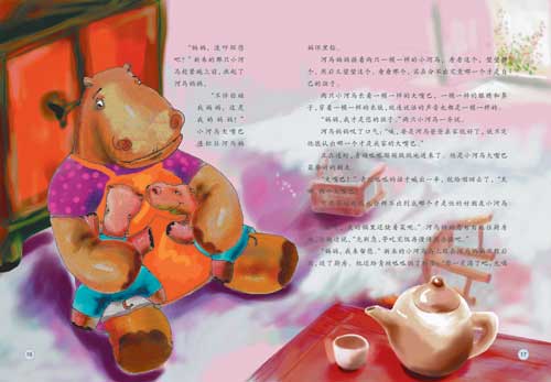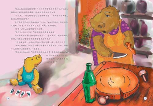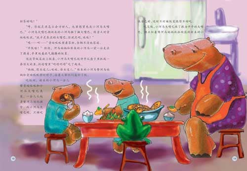 “妈妈,我来帮您。”新来的小河马马上跟在河马妈妈屁股后面,进了厨房。他还给青蛙呱呱倒了杯茶:“你一定渴了吧,先喝杯茶好吗?”