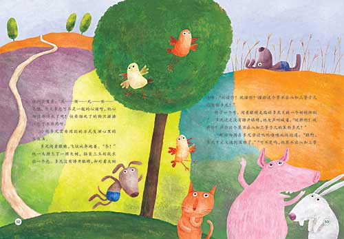 在家门口,多尼看见八只小鸡正在草地上找吃的。忽然,一只小鸡兴奋地叫起来,原来她发现了一条又肥又大的虫子。别的小鸡赶紧跑过去,和她争抢起虫子来。这时,又从远处跑过来三只小鸡,十一只小鸡挤成一堆在打架呢。