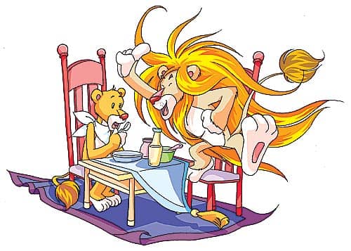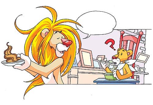 狮妈妈刚要吃,狮大王说:“慢,还加点护发素。这也是宫廷厨师们特制的护发素,可以保护已经长出来的头发。”