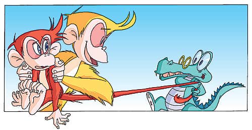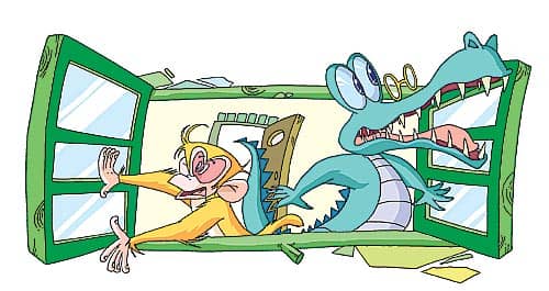 鳄鱼医生把嘴张大,给猴妈妈看他满嘴尖尖的牙齿:“看到了吧,就用我的嘴来动手术,只要一口,就把小猴的长尾巴咬断。”