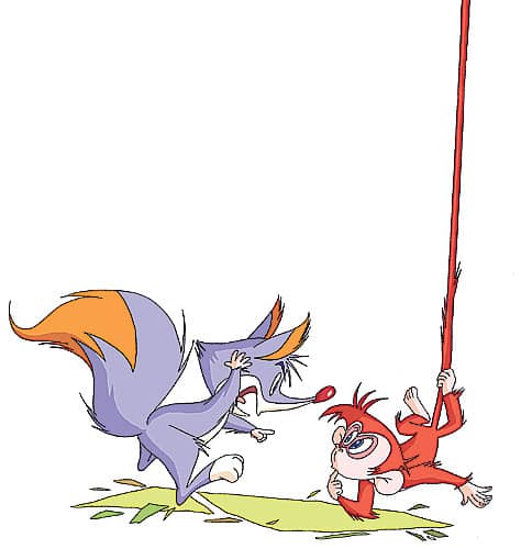 这时,一只小狐狸正在低头走路,小猴荡下来的时候,正好一下把小狐狸撞倒了。“啊哟!”小狐狸扑通一声摔倒在地上。“好疼呀!”小狐狸摸摸被撞疼的脑袋,很生气。“小猴,你为什么要撞我?”小狐狸说。