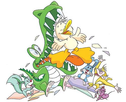 大家看见,在鳄鱼的嘴里,站着一只小鸭子,他正眨巴着眼睛,奇怪地朝大家看呢。