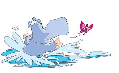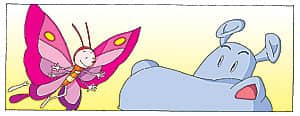 忽然飞来了一只花蝴蝶,停到了大河马的脑门上。“哈,蝴蝶来和我玩啦!”大河马张开大嘴巴,开心地喊了起来。