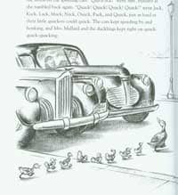 “鸭子!”迈克喊道,“快,快派一辆警车来!”说话间,鸭子们已经走过了拐角书店,来到了查尔斯大街。“嘎嘎,嘎嘎!”小鸭子们排队紧紧跟随着他们的妈妈。