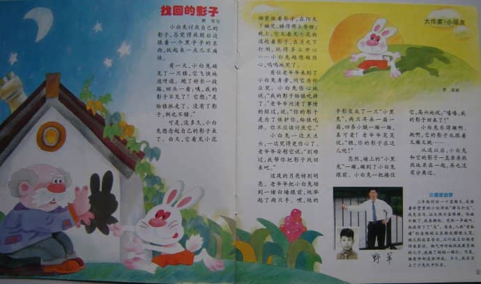 这天夜晚的月亮特别明亮,老爷爷把小白兔领到一堵白墙跟前,他举起了两只手。嘿,他的手影变成了一只“小黑兔”,两只耳朵一扇一扇,四条小腿一蹦一蹦,真可爱!老爷爷笑笑说:“瞧,你的影子在这儿呢!”