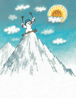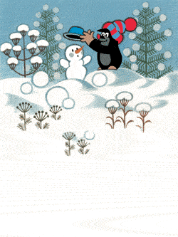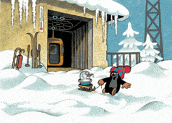 从终点站走出来,小鼹鼠立刻动手做事。他用雪团成两个大雪球和两个小一点的雪球,好好地把它们装在一起——雪人又恢复了原状。然后他帮雪人租了一对滑雪板,自己也坐上雪橇,回过头去大声喊:“雪人再会!明年冬天见!”