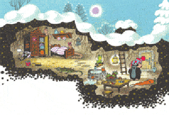1.通常,动物们最讨厌冬天,所以往往整个冬天都在睡觉。有时候,会有野兔的耳朵或者松鼠的尾巴从雪堆里露出来,但是很快他们就又缩回洞里去了。小鼹鼠也正在准备他的冬眠。他已经在地下的小屋里存好了粮食,因此就不用再外出了。不过,在安顿下来之前,他很想再到外面去看一眼,看看冬天真正的样子。