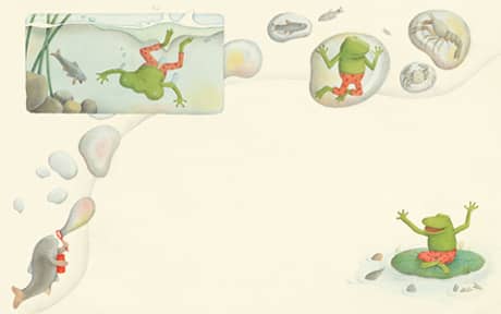 最神奇的是,小鱼儿吹出一个大泡泡儿,青蛙一闪身,竟然钻进了泡泡里,泡泡儿带着青蛙在水里飞。