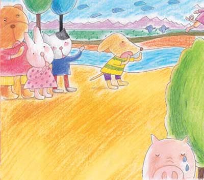 园里,大象老师请每个上台唱一首歌,小猫边跳边唱:“今天天气真好,花儿都开了……”唱得真好听,大家拼命鼓掌;小狗粗着嗓门儿,唱了一首《老鼠爱大米》;然后小羊唱了、小熊唱了,就连说话细声细气的小兔也唱了。轮到小猪了,小猪红着脸, 只会说“我——不——不——”还把头摇得像个拨浪鼓。