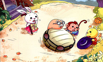 小猴子说:“看我的!”他推了推乌龟爷爷,还是推不动。