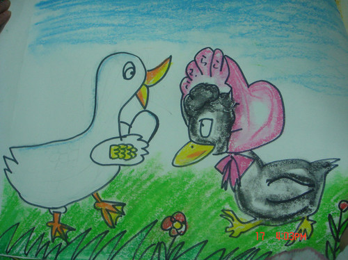 鸭妈妈赶紧拿起自己的蛋,看了又看,摸了又摸,说:“哦!原来我生的蛋不大不小的、淡青色、椭圆形的呀。”