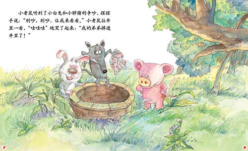 小老鼠听到了小白兔和小胖猪的争吵,摆摆手说:“别吵,别吵,让我来看看。”小老鼠往井里一看,“哇哇哇”地哭了起来:“我的弟弟掉进井里了!”