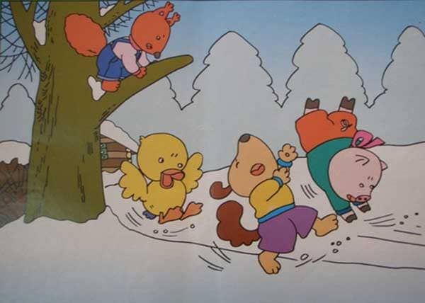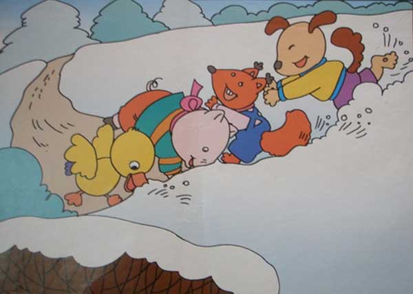 下大雪了!大雪把房子、树、草地都变成了白色,小路也不见了。小猪跑出来滑了一跤,小狗跑来滑了一跤,小鸭跑来也滑了一跤。